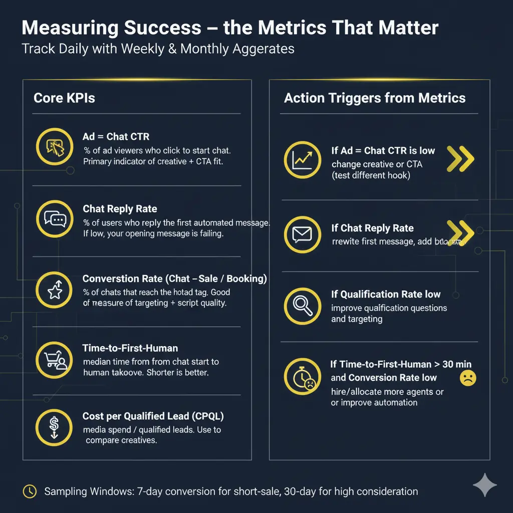 - Conversion Rate (Chat → Sale / Booking): ultimate metric. Measure per campaign and per creative.