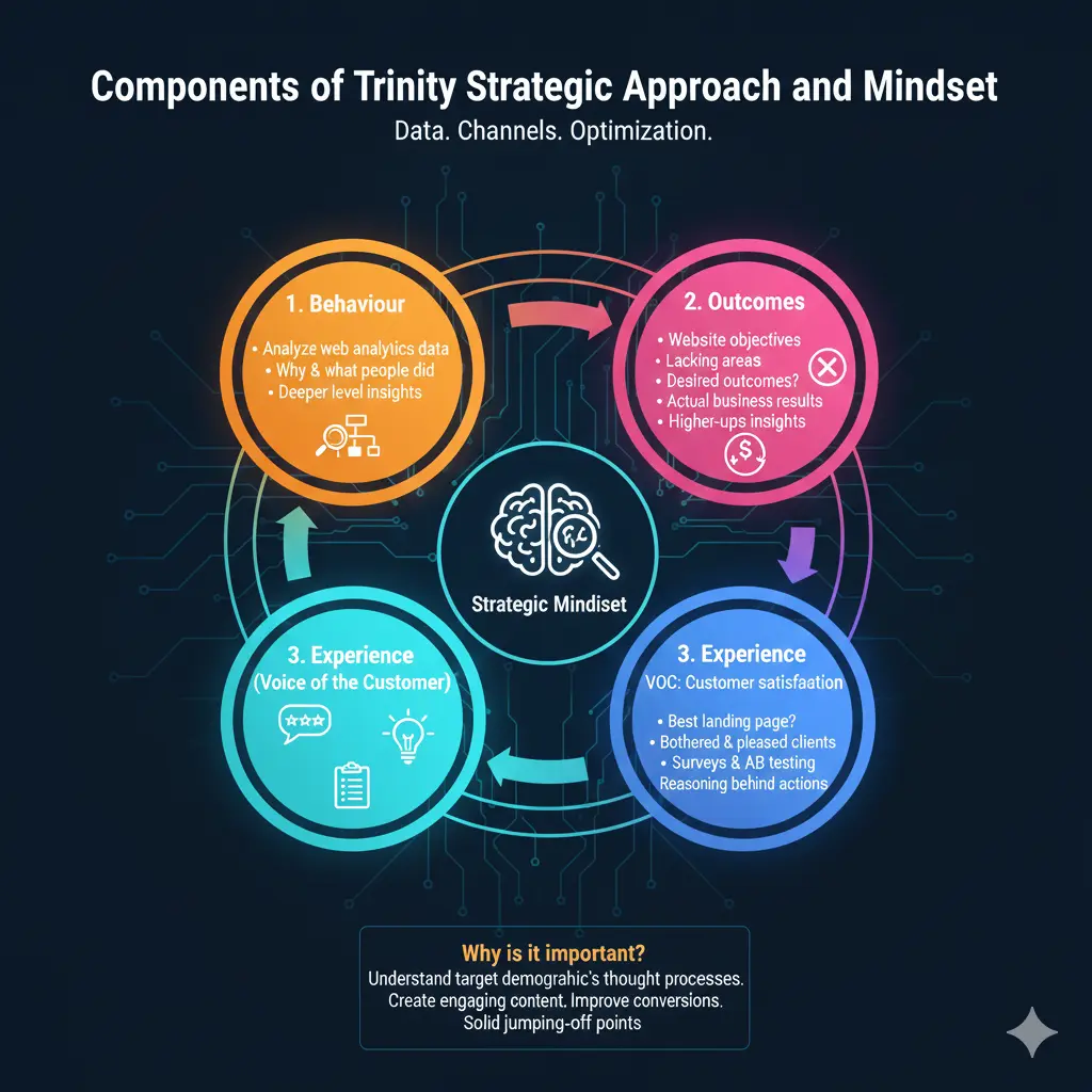 Analyzing the piles and piles of web analytics data that we collect daily is the behaviour of the trinity strategy. This component helps you take a look at your web analytics data at a different level. Furthermore, to conduct some analysis on why and what people did on your website.