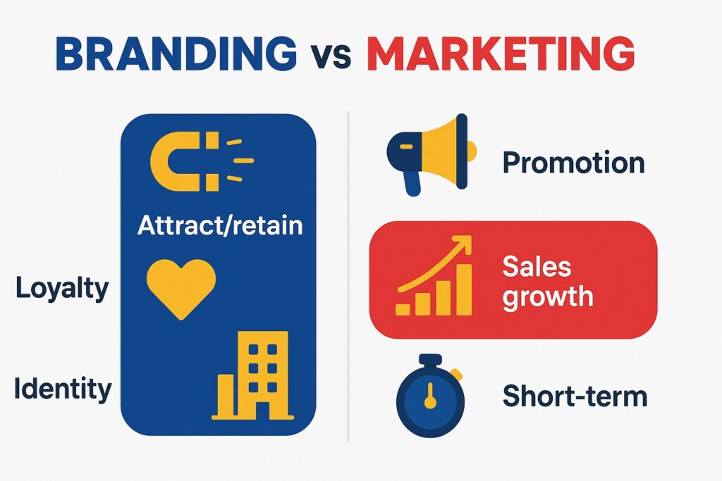 So, now that we’ve established what they are, let’s discuss the fundamental distinctions between marketing and branding: