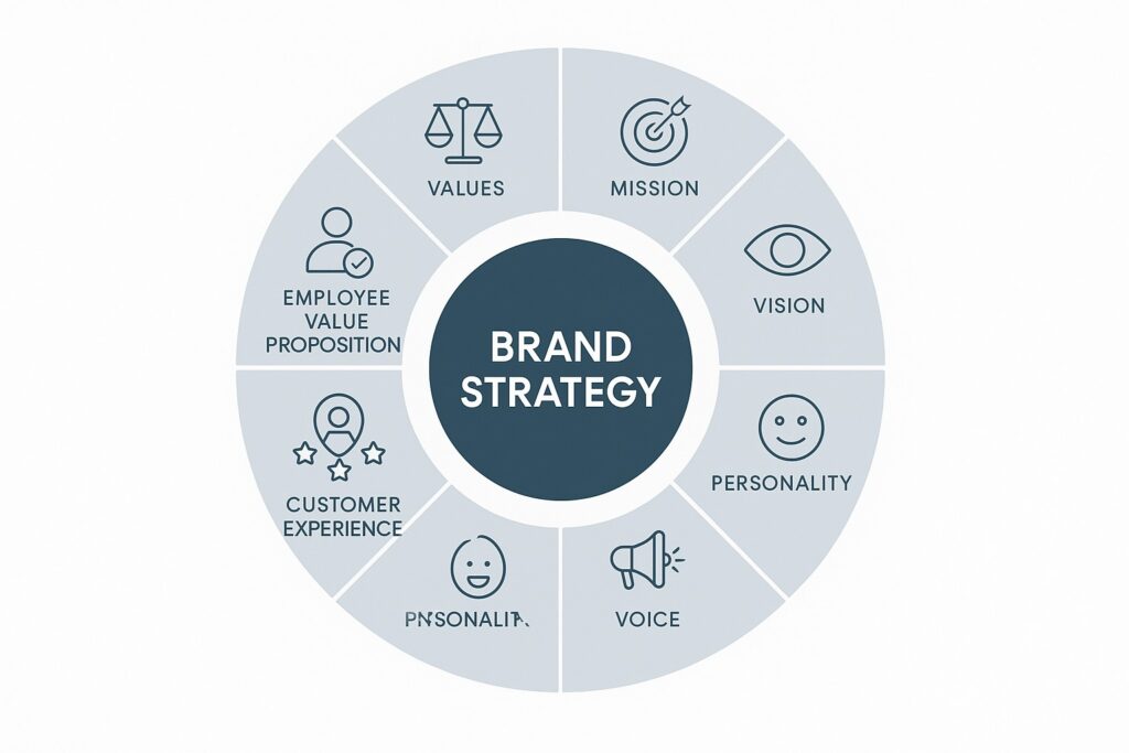 A brand strategy is a component of your company that specifies your voice, purpose, and general direction of your business and marketing efforts.